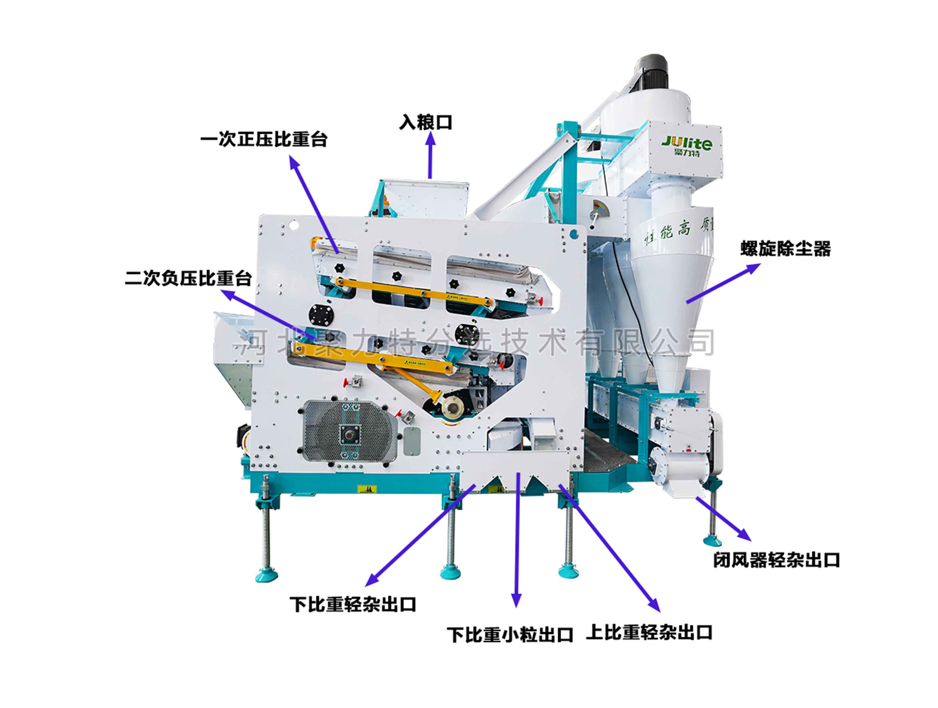 物料通過提升機(jī)經(jīng)喂入斗進(jìn)入第一道負(fù)壓比重臺,通過風(fēng)選去除物料中的粉塵、糠殼等輕雜質(zhì),輕雜經(jīng)風(fēng)道、旋風(fēng)除塵器,由閉風(fēng)器排出;通過比重選有效去除物料中的秸稈、軸芯等比重較輕的雜質(zhì)。然后物料通過導(dǎo)糧機(jī)構(gòu)進(jìn)入第二道正壓比重臺,通過調(diào)整風(fēng)量、擋板位置等進(jìn)行比重加工,去除物料中的碎粒、秕籽、芽粒、蟲蛀粒、霉變粒等雜質(zhì)。最終成品從比重臺高處排出。